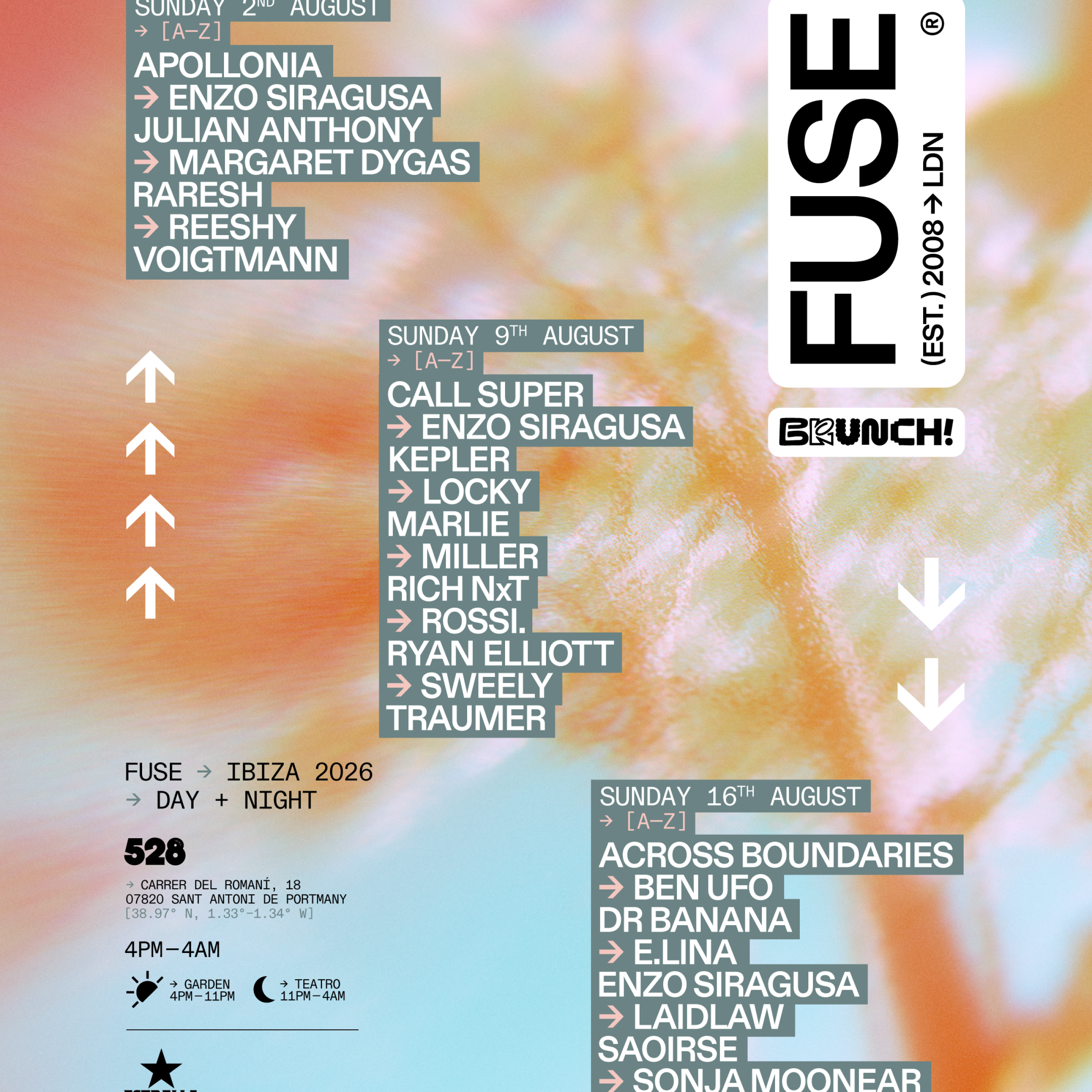 FUSE reveals the full line-ups for its Ibiza series with Brunch Electronik this summer, returning to 528 across Sunday 2nd, 9th, and 16th August 2026.