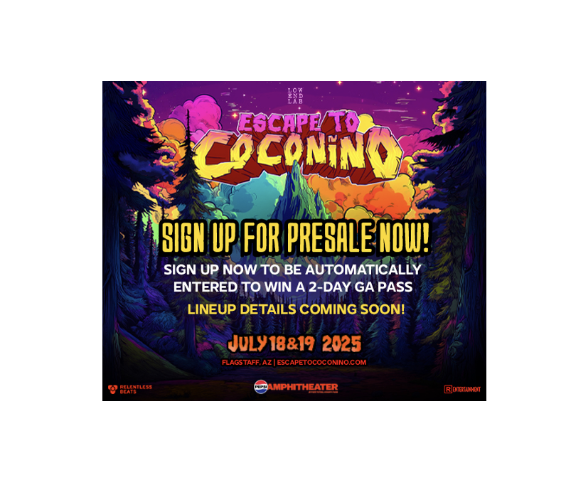 Presale sign-up is now available at escapetococonino.com for a limited time. Everyone who signs up for the presale is automatically entered to win a two-day GA pass to Escape to Coconino. Stay connected with Escape to Coconino on social media at @coconicocampout. Visit www.relentlessbeats.com for the most up-to-date information on all Relentless Beats events. Stay connected on Instagram and Twitter at @RelentlessBeats and Facebook at www.facebook.com/RelentlessBeats.