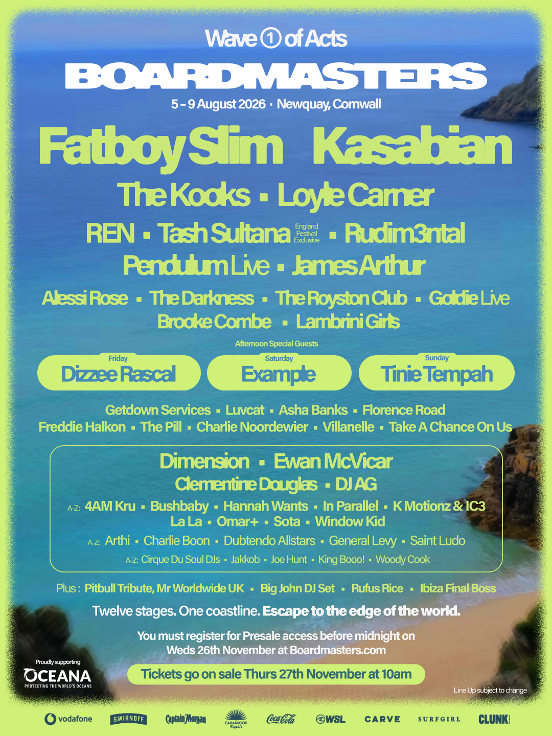 Everyone has heard of Boardmasters. But only those who’ve felt the wind, the waves and the bass know what it really is. Once again this August you are invited to taste the salt and ride the rhythm of the ocean for five days of raw, unleashed Cornwall across two coastal sites in Newquay. 2026 Presale Tickets go on sale Thursday 27th November at 10am but fans must sign up to the Presale for exclusive 24 hour access at boardmasters.com. It closes at midnight on Wednesday 26th November, with tens of thousands already signed up so don’t miss out.