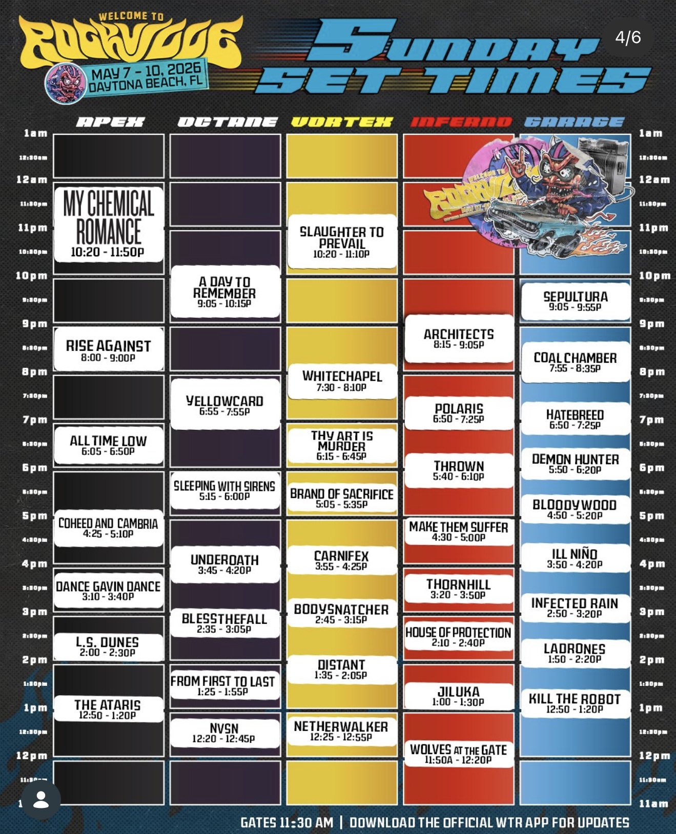Rockville has also announced massive improvements to the Garage Stage, boasting better sound, bigger production, more shelter from the sun, and a completely tented platform with up to 15,000 sq ft of coverage. Further updates to the festival grounds include an all-new section called The Pit Stop, located near the Apex Stage. This area contains extra culinary choices, additional shade, and its own merch station with both vintage gear and 2026 Welcome to Rockville merch. There will also be special performances, artist interviews, and more!