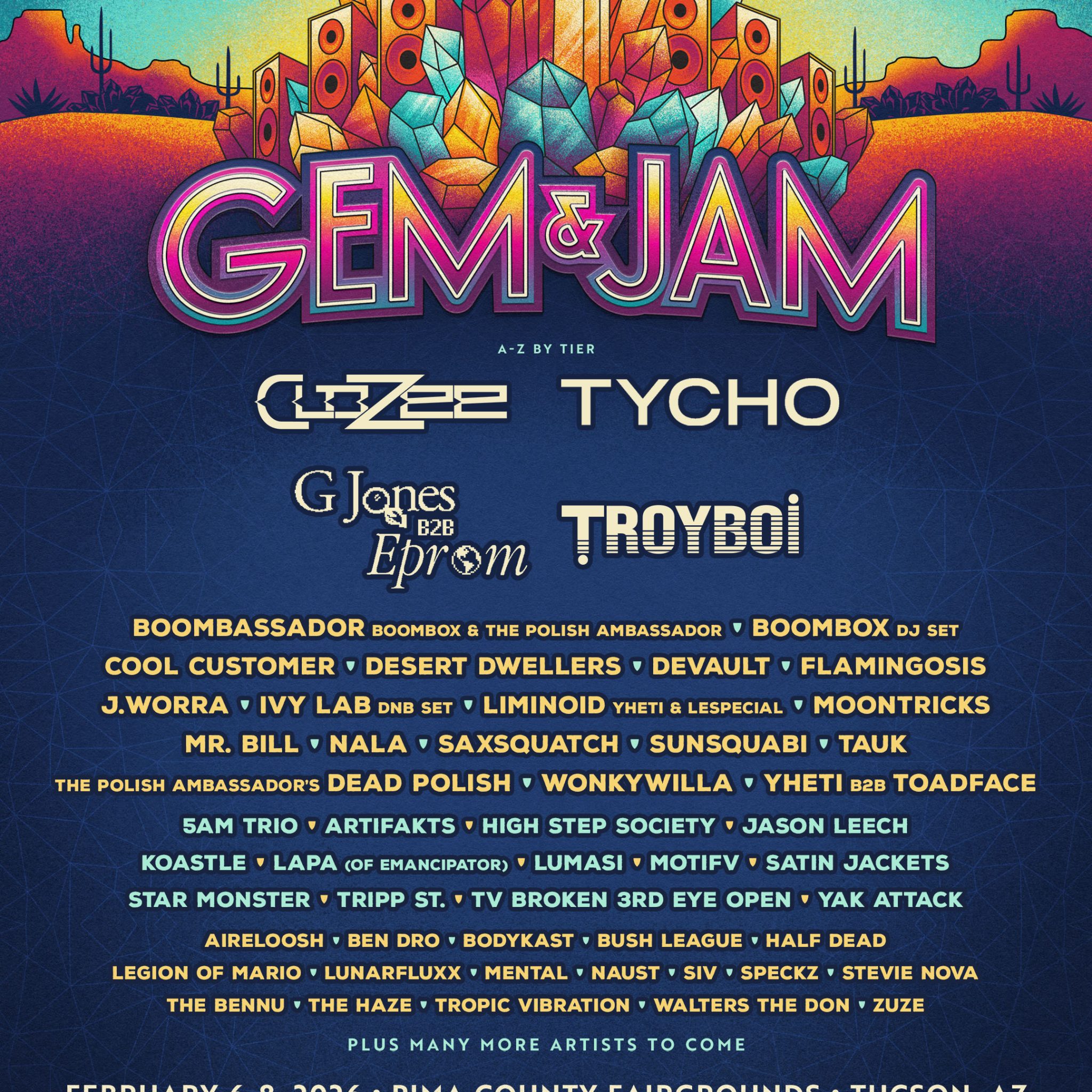 Gem & Jam Festival returns to the Arizona Desert February 6–8, 2026, taking over the Pima County Fairgrounds (11300 S. Houghton Rd., Tucson, AZ) for three days of crystals, art, and late-night sound. Rising from the Tucson desert like a living mirage, Gem & Jam blends captivating crystals, immersive art, and thundering sound into a world entirely its own! This show is not only family friendly, full of amenities and accommodations, but it’s also built like a glittering desert city that doesn’t sleep. With CloZee, Moontricks, Tycho, G Jones b2b EPROM, and TroyBoi headlining, plus an 80 more artists in a lineup that includes bass, jam, and everything in between. Expect gates to open around noon, with music rolling deep into the night, plus immersive installations, artist galleries, live painting, daytime workshops, and gem & mineral exhibits threaded through the weekend like hidden treasures. Being the 17th annual installation of the festival, this is surely one you won’t want to miss!