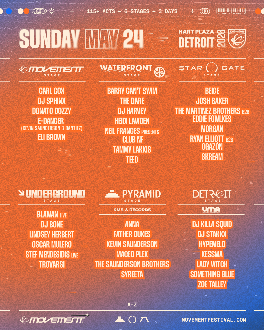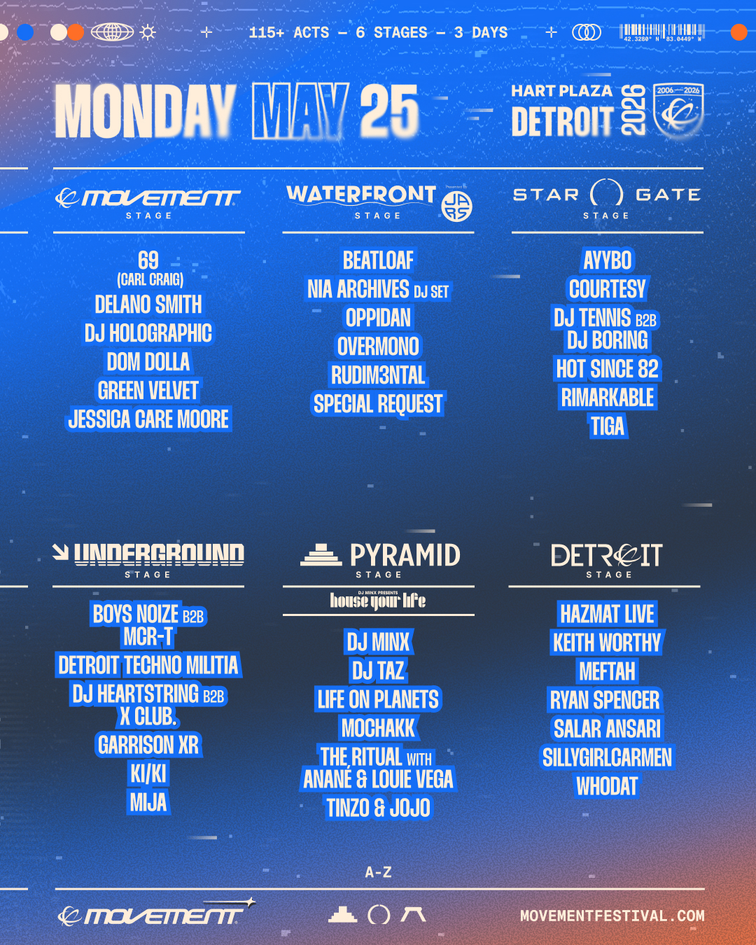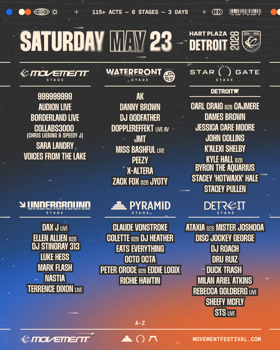 Set against the industrial-meets-waterfront backdrop of Hart Plaza, Movement 2026 will once again transform downtown Detroit into a three-day celebration of sound and culture. The festival’s returning stage architecture – Movement Stage, Waterfront Stage presented by JARS, Stargate Stage, the Underground Stage, Pyramid Stage, and Detroit Stage offers a carefully curated journey through techno, house, and everything orbiting in between.