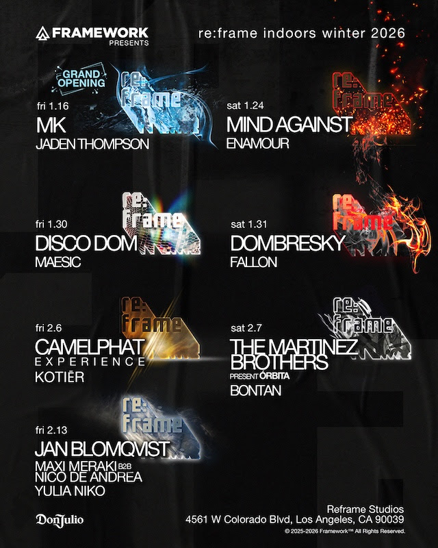 Framework, one of the world’s leading independent purveyors of underground music experiences, has unveiled the season calendar for its latest event concept: re:frame. The inaugural series will unfold within Reframe Studios, a state-of-the-art soundstage in Atwater Village that will, for the very first time, be transformed into an innovative, large-scale nightclub experience. Leveraging the studio’s controlled interior environment, Framework’s re:frame series will pair custom-built audio and visual production to accompany headlining performances from some of the world’s top house and techno artists – a sparkling addition to Framework’s portfolio that further cements the LA-based company as a driving force in the city’s cultural landscape.