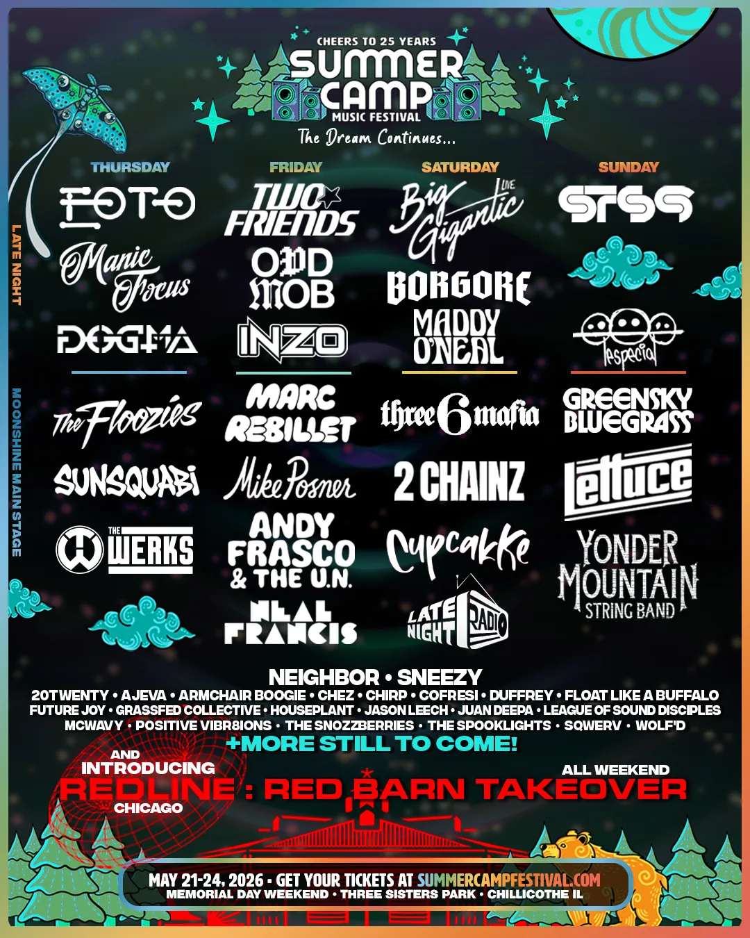 This year’s lineup brings us right back to our SCamp roots- with Eoto, Dogma, Manic Focus, Inzo, Maddy O’Neal, STS9, The Floozies, Three Six Mafia, Andy Frasco, Sunsquabi, Lettuce, Yonder Mountain String Band, and so many more. One thing about SCamp is that it melds together your favorite jam bands with some funky EDM and dubstep in the mix. I am curious how they plan to roll things out this year- usually it’s jammy during the day and wubby at night. However, I am very sad that moe. and Umph won’t be there. Is there really SCamp without them? I guess we will see how things go!